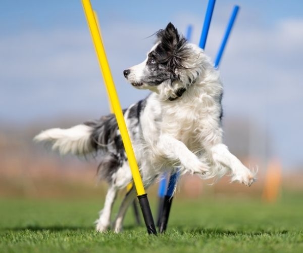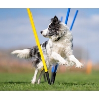 Suggestie voor oefening: Zet een stok op de houder en leer de hond linksom en rechtsom om de stok heen te lopen. Doe dit eerst met behulp van iets lekkers in je hand en probeer dit later op afstand. Begeleid de hond om de stok heen en benoem daarbij wat de hond doet 'rechtsom' of 'linksom'. Als de hond deze oefening goed beheerst kun je de afstand van de stok gaan vergroten en de hond er zelf omheen laten rennen.