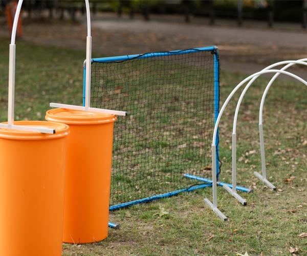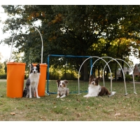 De hekjes kunnen ook gebruikt worden als sturing bij het aanleren om door een Hooper heen te lopen of juist als begrenzing om een wat moeilijkere bocht simpeler te maken voor de hond.