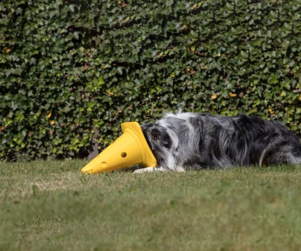 Nog een leuke oefening waarvoor je alleen een pion nodig hebt: de oefening ‘punthoofd’, waarbij je de hond leert zijn snuit in de pion te steken. Vaak zal een hond zelf al uit nieuwsgierigheid zijn neus een stukje in de pion steken als je hem die horizontaal voorhoudt. Benoem en beloon dat moment: ‘Goed zo, dát is punthoofd!’
