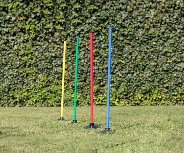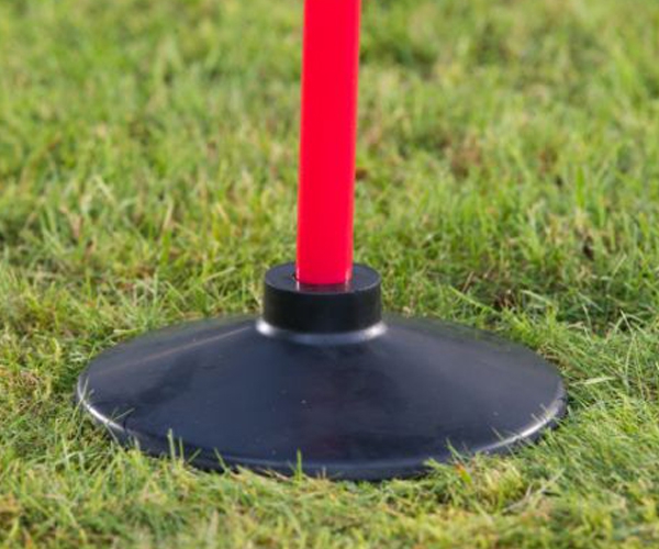 De rubberen voeten zijn extra verzwaard en staan hierdoor heel stevig. De rubberen voeten zijn zowel binnen als buiten te gebruiken. Te combineren met stokken om een slalom of horden parcours van te maken voor agility- of behendigheidstraining.